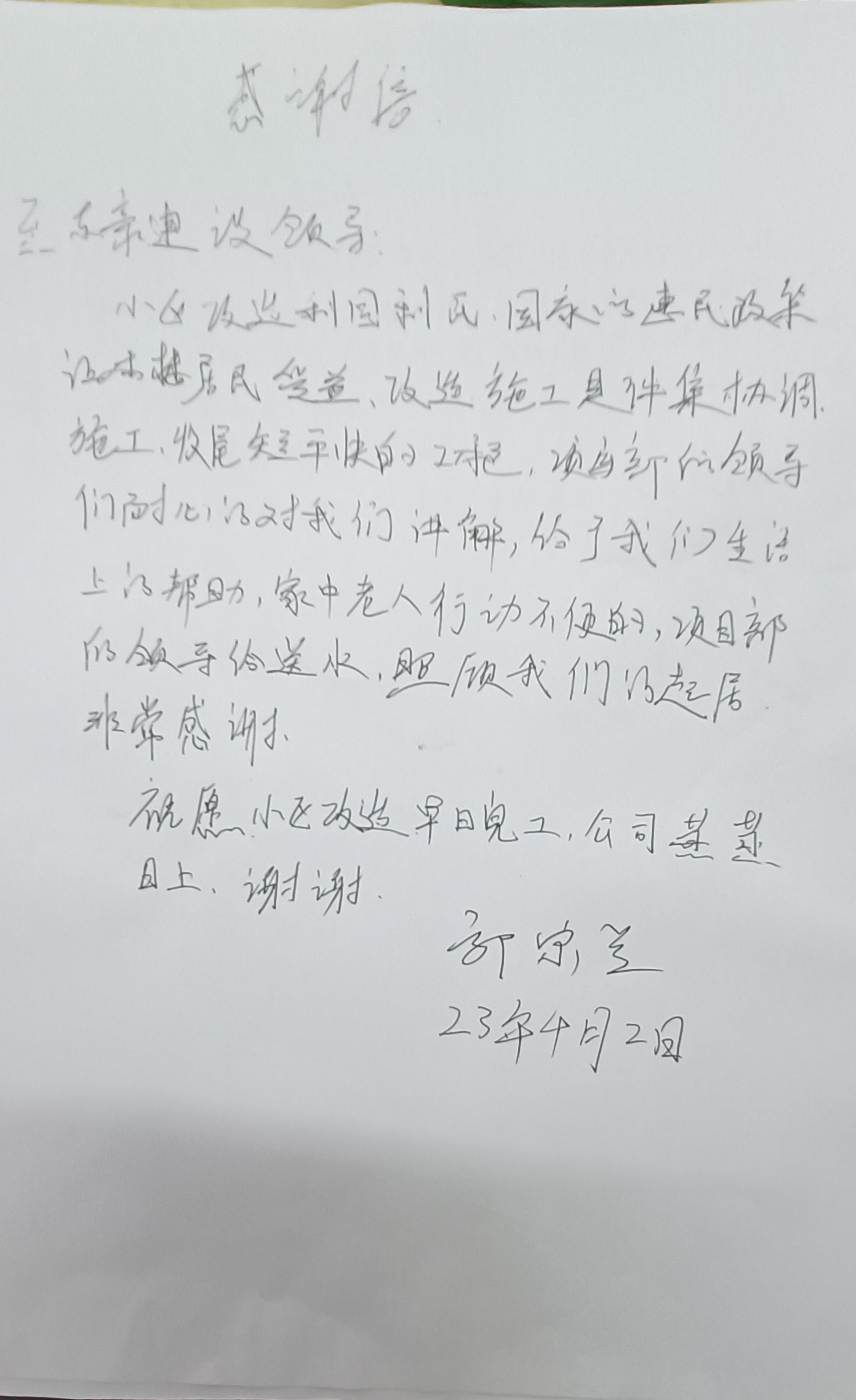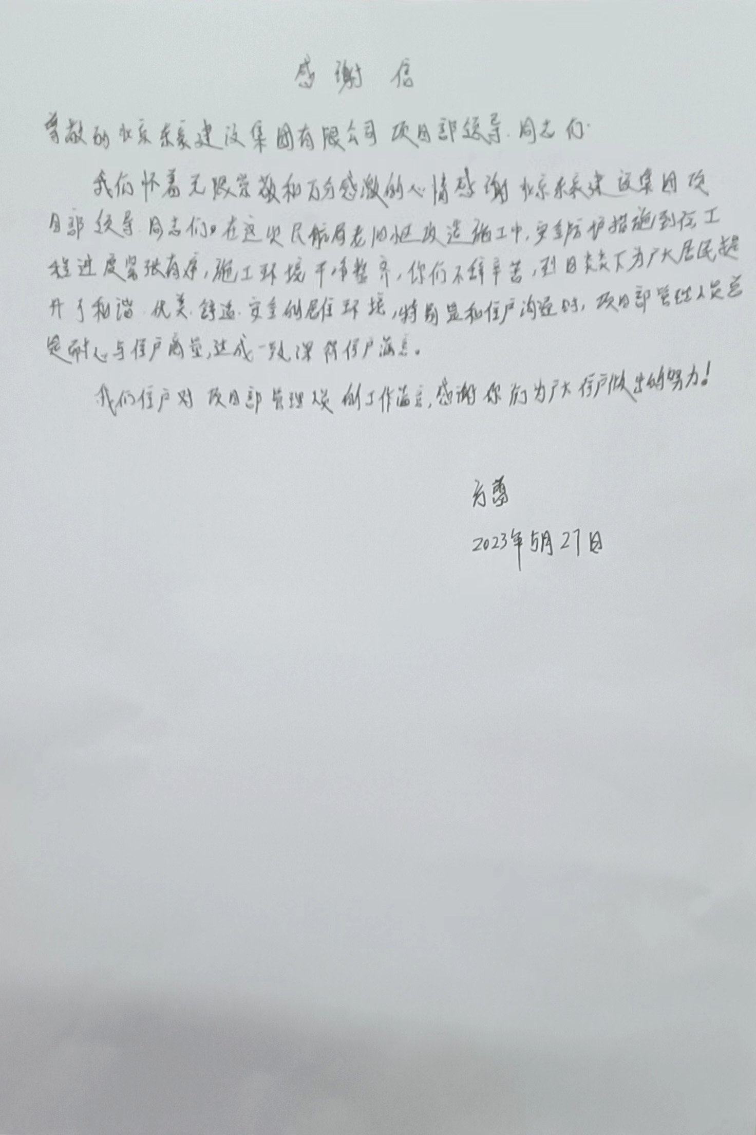 近日,民航局水碓子北里3号楼综合整治项目喜获业主感谢信。信中,小区业主对项目管理团队的工作给予了高度评价,项目部团队在小区改造施工中,安全防护措施到位,工程进度紧张有序,施工环境干净整齐,为广大居民提升了和谐、优美、舒适、安全的居住环境。对项目部自开工以来的辛勤付出与认真负责表示衷心的感谢。