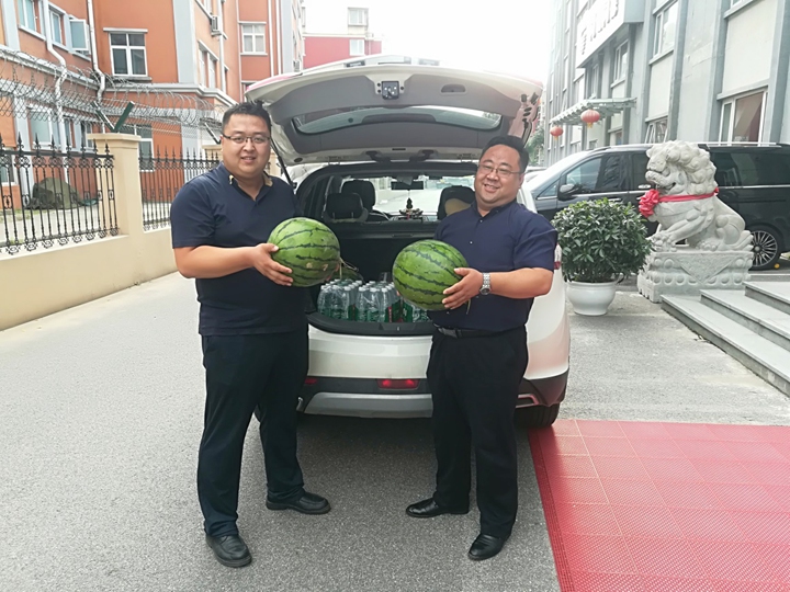 根据集团董事会关于加强暑期施工现场管理工作的通知精神,为了保障所有在施工程项目的顺利实施和一线员工的身体健康,集团工会研究决定:开展暑期“送清凉、促生产”慰问活动。工会委员带队,为一线员工送去:西瓜、矿泉水、毛巾、藿香正气水等防暑降温用品。