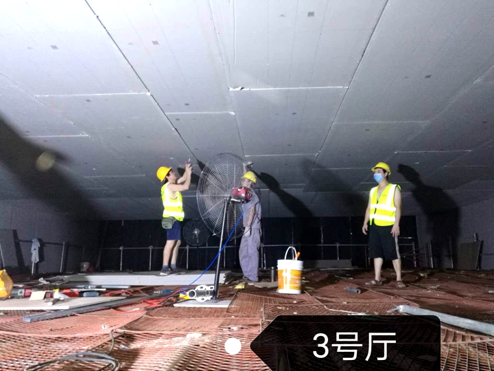 施工已完成一号厅:影厅前后墙墙面龙骨施工中,墙面玻璃棉施工中,空调风管施工中,脚手架搭设完成。二号厅:墙面龙骨施工完成,空调风管完成,墙面玻璃棉完成,转换层完成,吊顶主龙骨完成,吊顶副龙骨完成,墙面石膏板完成,顶面基层封板完成,脚手架搭设完成。三号厅:墙面龙骨施工完成,空调风管完成,墙面玻璃棉完成,转换层完成,吊顶主龙骨,副龙骨完成,墙面石膏板完成,顶面石膏板完成,脚手架搭设完成。四号厅:墙面龙骨施工完成,空调风管完成,墙面玻璃棉完成,转换层完成,吊顶主龙骨完成,吊顶副龙骨完成,墙面石膏板完成,墙面吸音板完成50%,脚手架搭设完成。五号厅:墙面龙骨完成,转换层完成,墙面玻璃棉完成,吊顶主龙骨完成,副龙骨完成,空调风管完成,墙面石膏板完成,墙面聚酯吸音板完成90%,脚手架搭设完成。六号厅:墙面龙骨施工完成,转换层完成,吊顶主龙骨完成,副龙骨完成,墙面玻璃棉完成,空调风管完成,墙面石膏板完成,墙面聚酯吸音板完成90%,脚手架搭设完成。七号厅:墙面龙骨完成,墙面玻璃棉完成,空调风管完成,吊顶转换层完成,墙面封石膏板完成,吊顶主龙骨完成,吊顶副龙骨完成,脚手架搭设完成。八号厅:墙面龙骨完成,空调风管完成,墙面玻璃棉完成,墙面封石膏板完成,吊顶转换层施工中,脚手架搭设完成。九号厅:墙面龙骨完成,墙面玻璃棉完成,空调风管完成,转换层完成,吊顶主龙骨完成,吊顶副龙骨完成,墙面玻璃棉完成,墙面石膏板完成,顶面石膏板完成,脚手架搭设完成。十号厅:现场墙体拆改完成,墙体砌筑完成,墙面龙骨完成,墙面玻璃棉完成,空调风管完成,厅内台阶钢架完成。十一号厅:墙面龙骨完成,空调风管完成,转换层完成,吊顶主龙骨完成,吊顶副龙骨完成,墙面玻璃棉完成,墙面石膏板完成,脚手架搭设完成。十二号厅:墙面龙骨完成,空调风管完成,转换层完成,吊顶主龙骨完成,吊顶副龙骨完成,墙面玻璃棉完成,墙面石膏板完成,脚手架搭设完成。公共区域:进场通道墙面龙骨完成,墙面玻璃棉完成,墙面封板挂网抹灰完成,墙面造型施工完成,进场通道吊顶主框架完成,大堂区域砌筑已完成,大堂区域吊顶施工中,大堂区域钢架施工中,办公区墙体拆除完成,墙面砌筑完成,更衣室、库房等区域施工中。