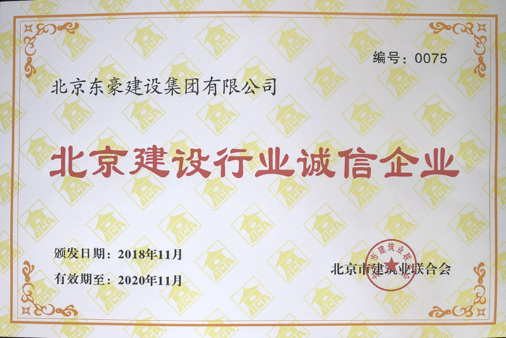 近期,北京香港六和盒宝典大全有限公司被北京市建筑业联合会评定为2018-2019年度 “北京建设行业诚信企业”、“北京建设行业AAA信用企业”称号。这是东豪自2011年以来连续8年荣获诚信企业、连续两届荣获AAA信用企业荣誉。