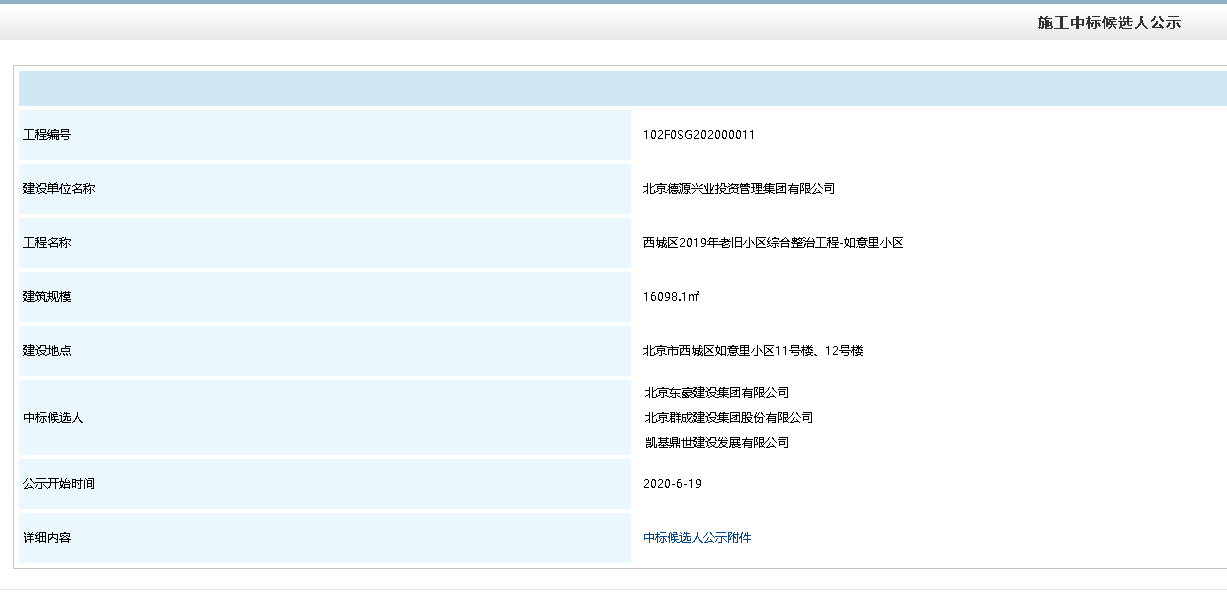 2020年6月18日,热烈祝贺东豪成功获得西城区老旧小区综合整治工程-如意里小区11号楼12号楼中标资格,项目中标金额:26125720.96元。该项目建设单位(项目业主)为 北京德源兴业投资管理集团有限公司,工程建设地点位于北京市西城区如意里小区11号楼、12号楼 ,工程建设规模 16098.1㎡ 。项目计划工期为205天,工程编号:102F0SG202000011。