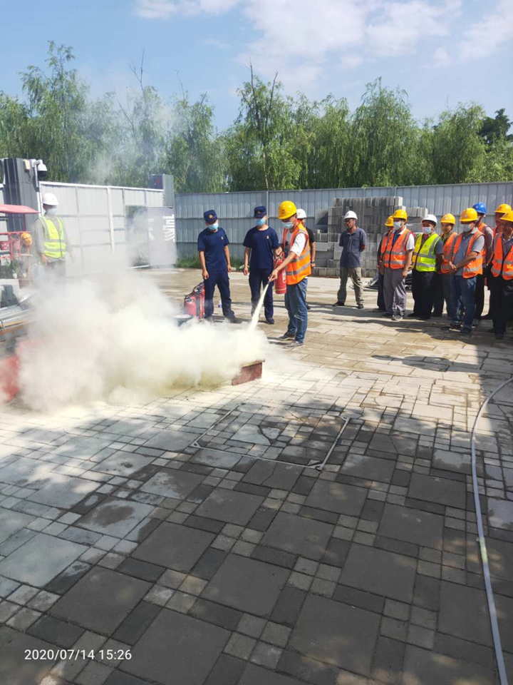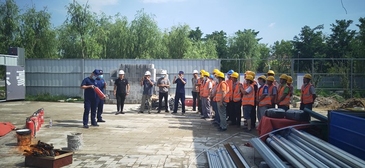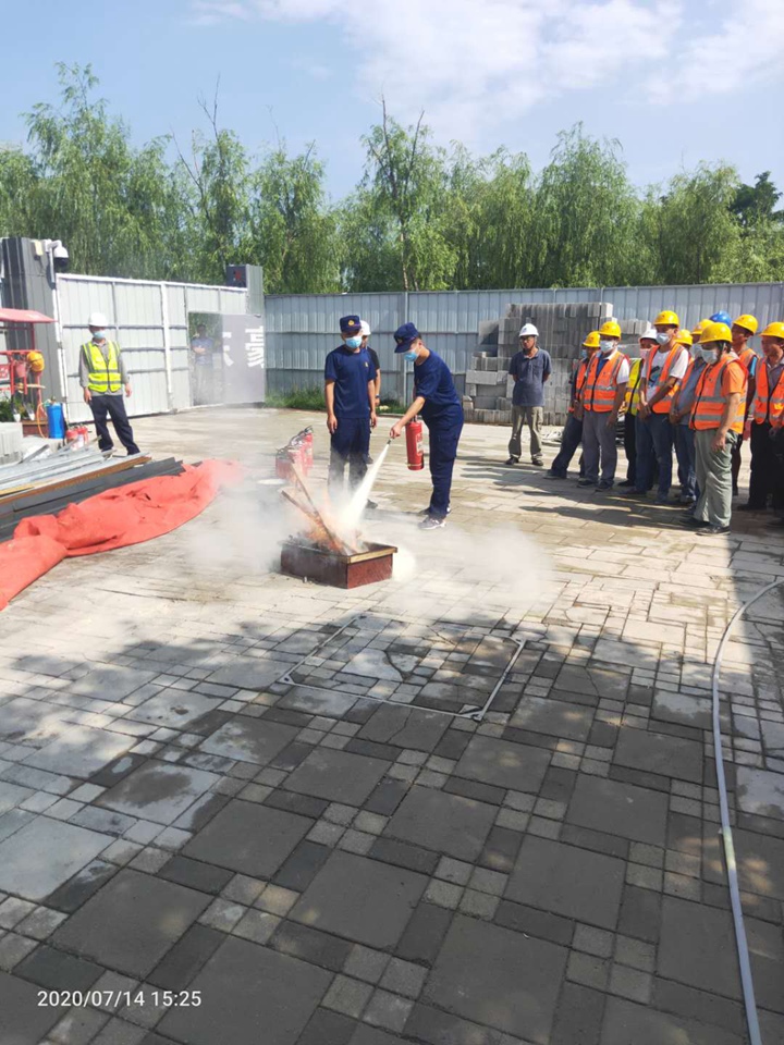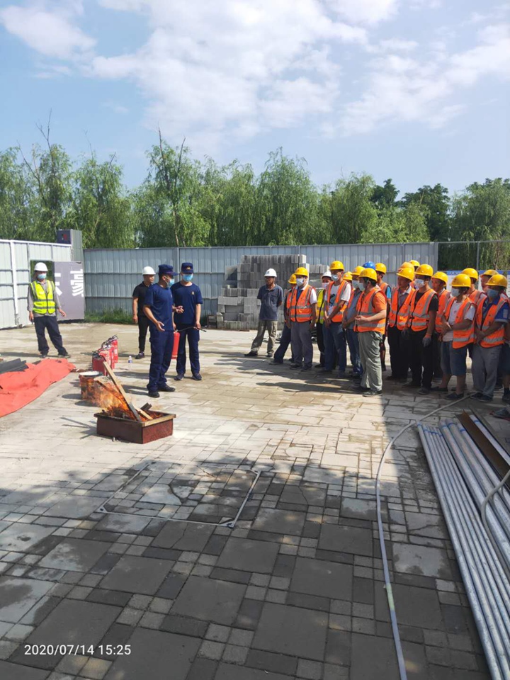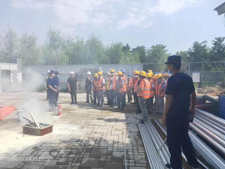 此次消防演练特别邀请了延庆消防支队的专业教官,教官详细向项目部施工人员讲解燃烧常识、火灾的形成、工程施工过程中的消防常识,并围绕夏季火灾防范的特点,从火灾的种类、逃生的基本技能、紧急疏散注意事项、灭火器的使用方法等方面着手,进行了讲解。