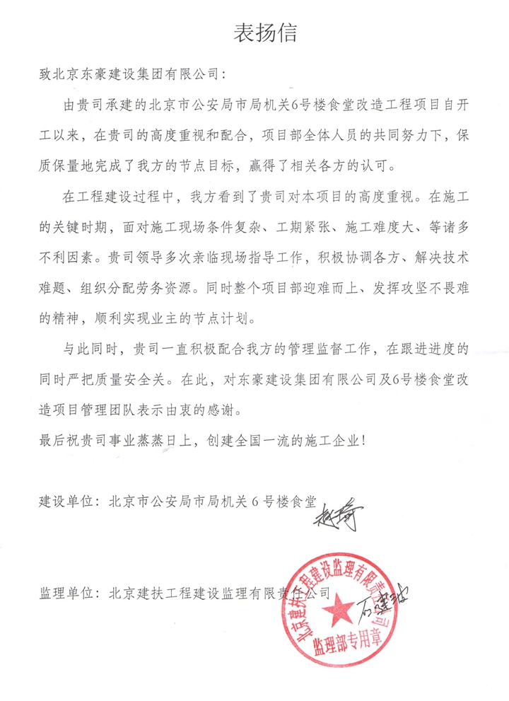 喜讯 东豪承建的市公安局机关6号楼食堂改造工程收到甲方和监理单位表扬信