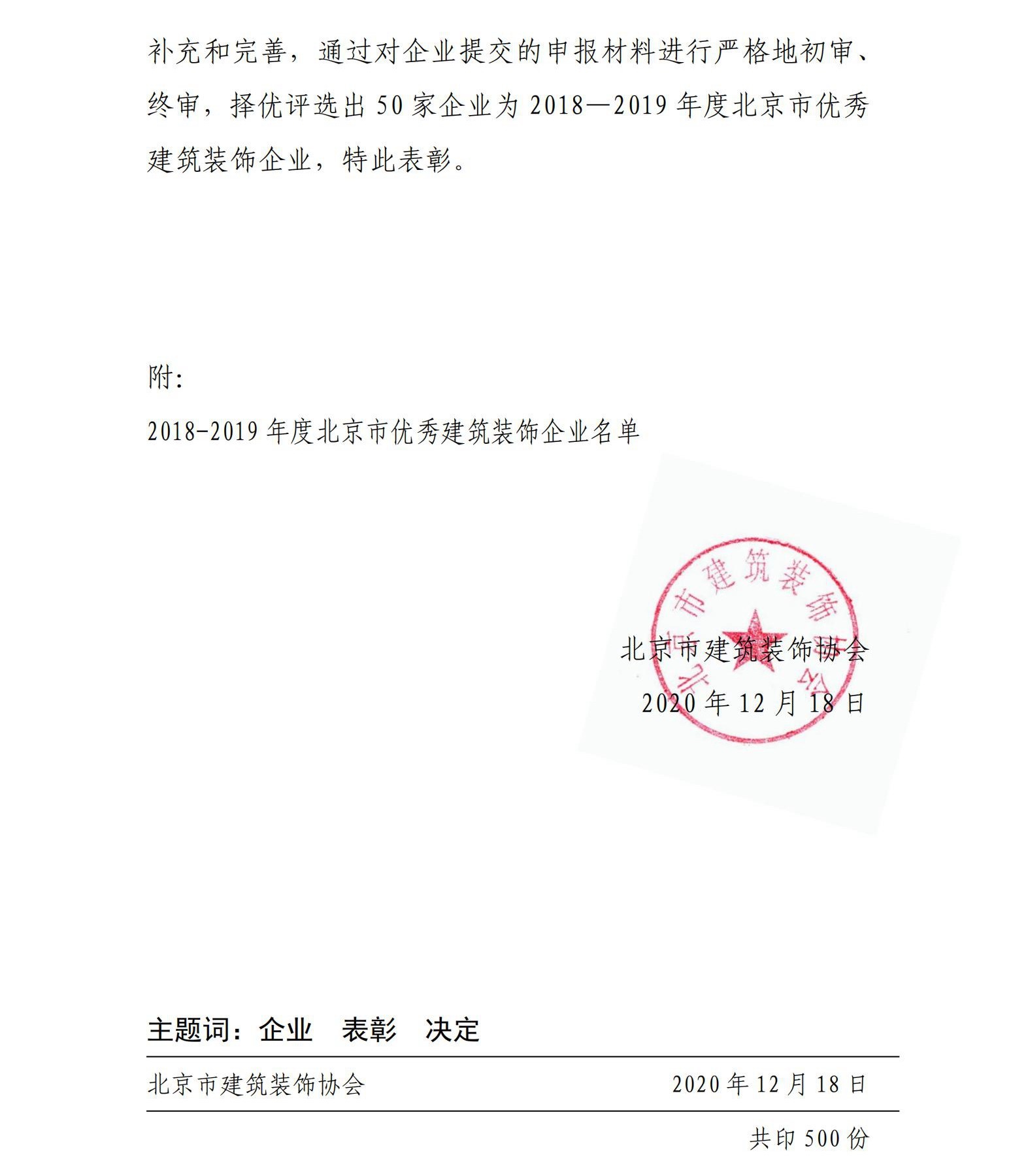近日,北京市建筑装饰协会发布了《关于表彰2018-2019年度北京市优秀建筑企业的决定》,香港六和盒宝典大全公司获得“北京市建筑装饰优秀企业”荣誉。