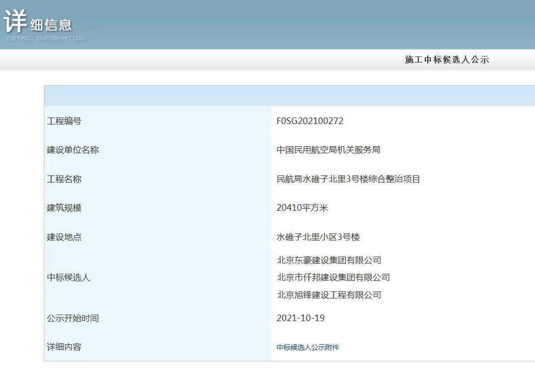 2021年10月18日,热烈庆祝北京东豪集团成功中标“民航局水碓子北里3号楼综合整治项目”,中标金额1977万元。工程建设单位为中国民用航空局机关服务局,工程建设规模20410平方米,建设地点位于水碓子北里小区3号楼。工期计划为323天。
