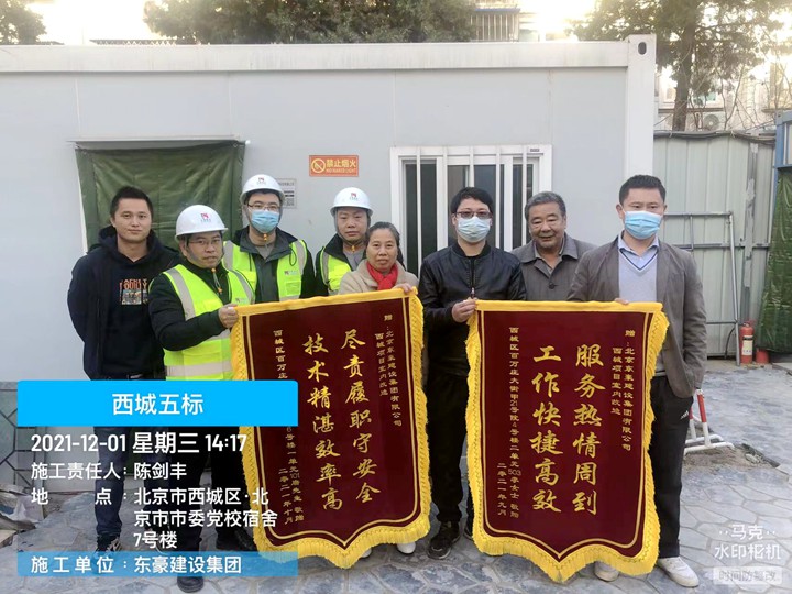 2021年12月01日,西城区百万庄大街甲21号院业主为东豪集团西城区老旧小区综合整治项目——第五标段项目部赠送锦旗,对项目管理团队在老旧小区改造过程中做出的积极贡献表示赞许和感谢。